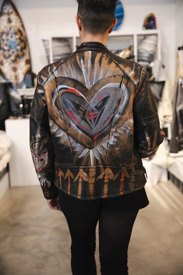 The Cali Couture Collection is a glimpse into Aviva’s love of fashion, crystals, and reverence for our planet. Repurposed used surfboards, skateboards, skis, guitars, vegan and natural Leather apparel, and accessories are her canvases. Painting is her passion and quite frankly, nothing is safe from her brushes and creativity. Join us in our quest to not only make beautiful one-of-a-kind items but also be part of an initiative to be sustainable.This collection is a manifestation of Aviva’s many years of curating, innovating surfaces, and celebrating the exquisite in the world. Mother Nature has been by her side with every step. “When I am painting, time stops and I am free to be my truest self. It is with gratitude that I found a tiny corner of the world where my designs and art serve as a way to connect with others. This connection requires no translation and knows no borders of geography, language, ethnicity, nor all those things that divide us. It is through art we have common ground. Custom commissions are available.